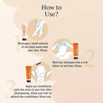 Massage body washes onto damp skin. Lather well. Rinse. Apply our shampoo on wet hair and work into a lather for a few minutes. Rinse out. Massage our conditioner onto the ends of your hair. Allow your hair to absorb the conditioner. Rinse.