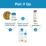 • A gentle yet effective body scrubber for dead skin is free from chemicals, therefore, safe for all skin types. The antioxidants in Sandalwood, Turmeric and Saffron help reduce suntan, and dark spots caused by continuous sun exposure, leaving your skin bright and glowing.