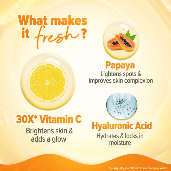 • Deeply Hydrates & Plumps Skin: If 30X Vitamin C is the cake, Hyaluronic Acid is the cherry on the top. While the essence serum brightens, HA locks in moisture & plumps up your skin. The result? Your skin is hydrated, fresh & youthful. *vs. Aqualogica Glow+ Smoothie Face Wash