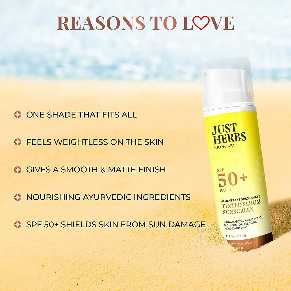 Just Herbs Tinted Serum Sunscreen with SPF 50+ PA+++ provides broad spectrum protection against UVA and UVB rays. Formulated with a nourishing blend of Aloe Vera and Pomegranate, it effectively hydrates, soothes and protects your skin from free radical damage.