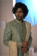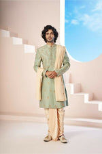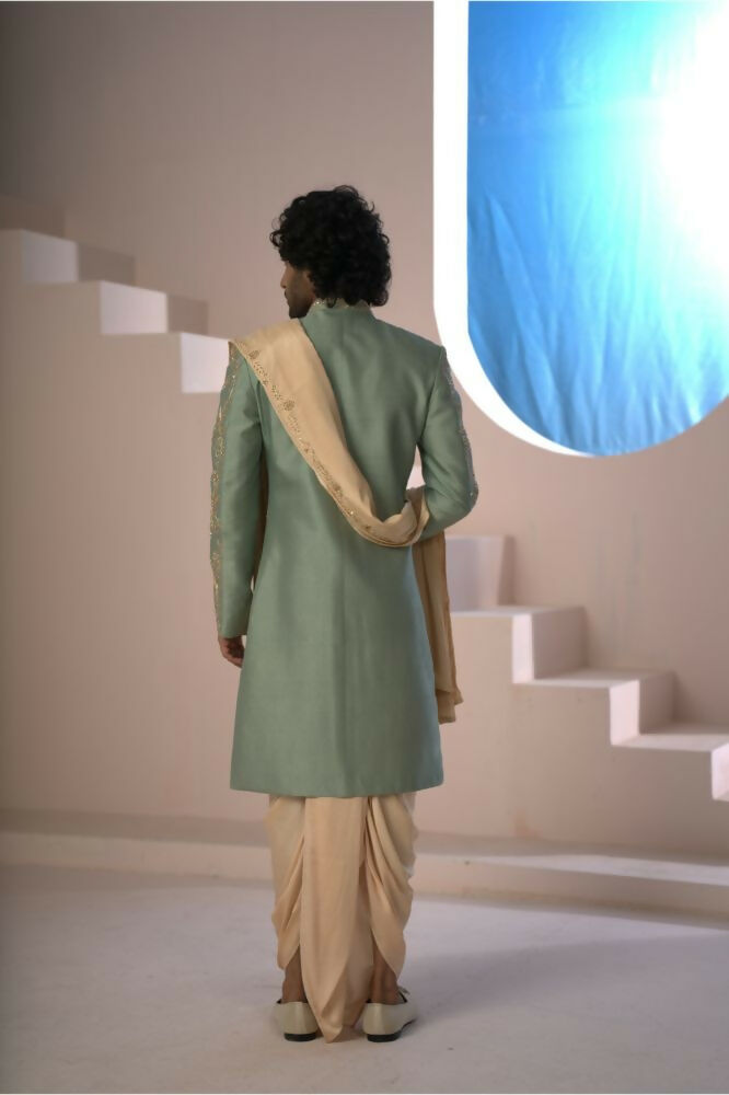 Majestic Mint Green Dupion Silk Sherwani With Satin Dhoti & Santone Dupatta by Hilo DesignThe olive green sherwani features exquisite hand-embr...