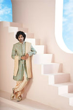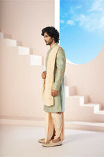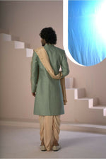 Majestic Mint Green Dupion Silk Sherwani With Satin Dhoti & Santone Dupatta by Hilo Design