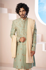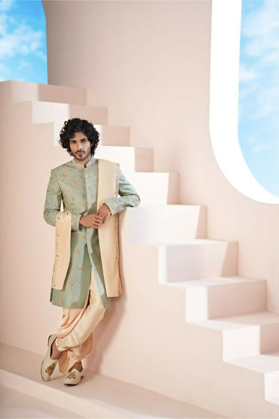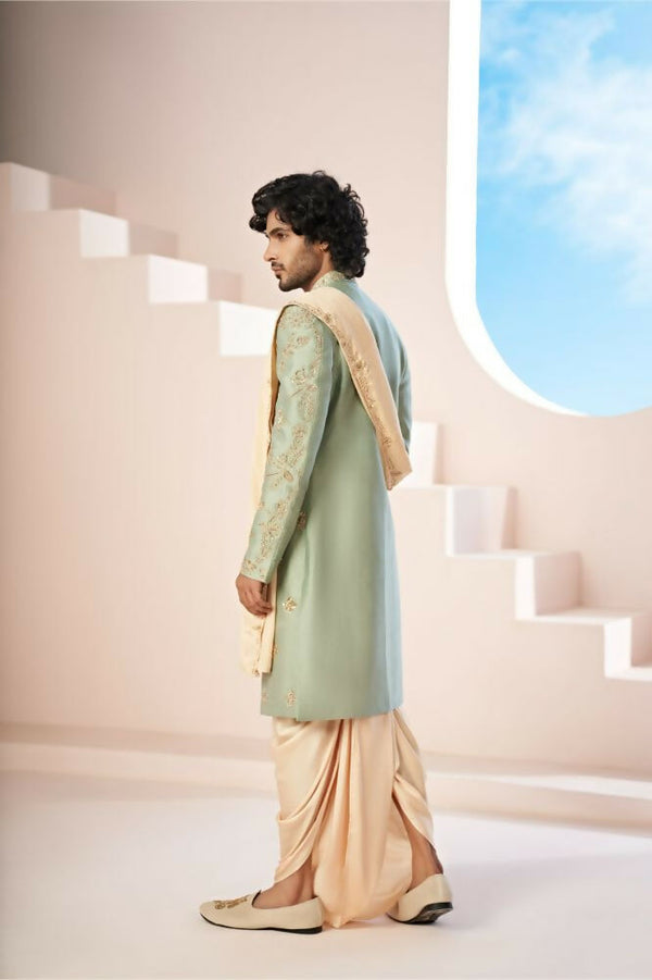 Majestic Mint Green Dupion Silk Sherwani With Satin Dhoti & Santone Dupatta by Hilo Design - XS