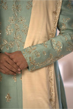 The olive green sherwani features exquisite hand-embroidered jal patterns, meticulously crafted to create a rich, textured design. The intricate embroidery is enhanced with opulent gold zardosi work, adding a luxurious and radiant touch. The combination of the deep olive green fabric and the shimmering gold embellishments creates a sophisticated and regal appearance, making it a perfect choice for formal and celebratory occasions.