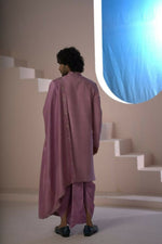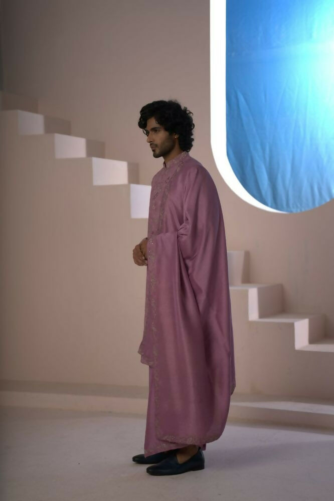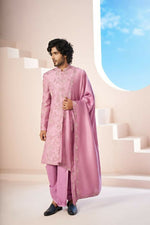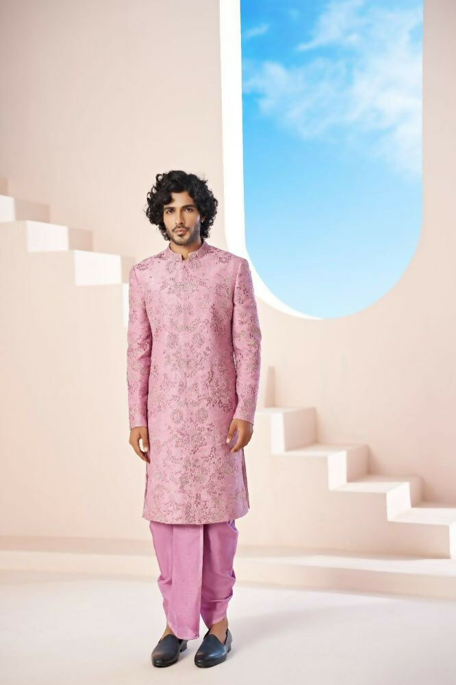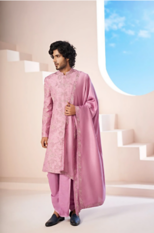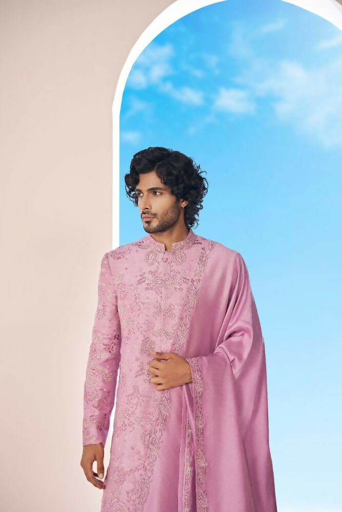 Majestic Orchid Falling Raw Silk Sherwani Set With Intricate Embroidery And Draped Dupatta by Hilo Design