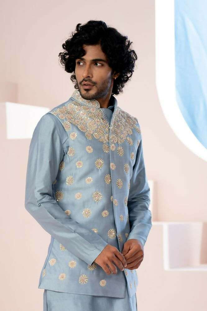 Open Nehru Jacket by Hilo DesignThe Jacket is made of Georgette and blend of seim raw silk, looks premium with slight sheen when exposed to light. ...