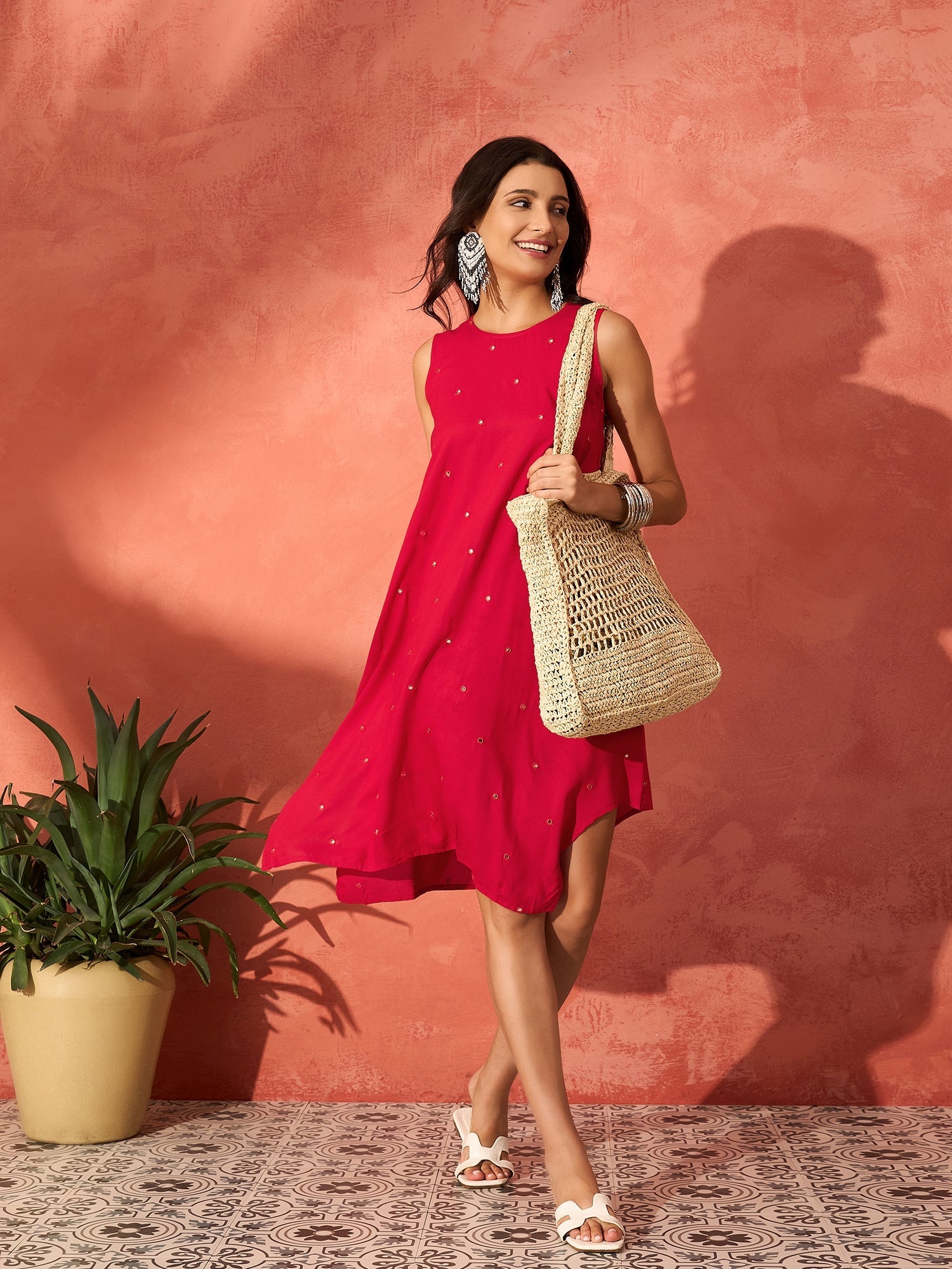 InWeave Red Mirror Work Round Neck W/S Dress - Distacart