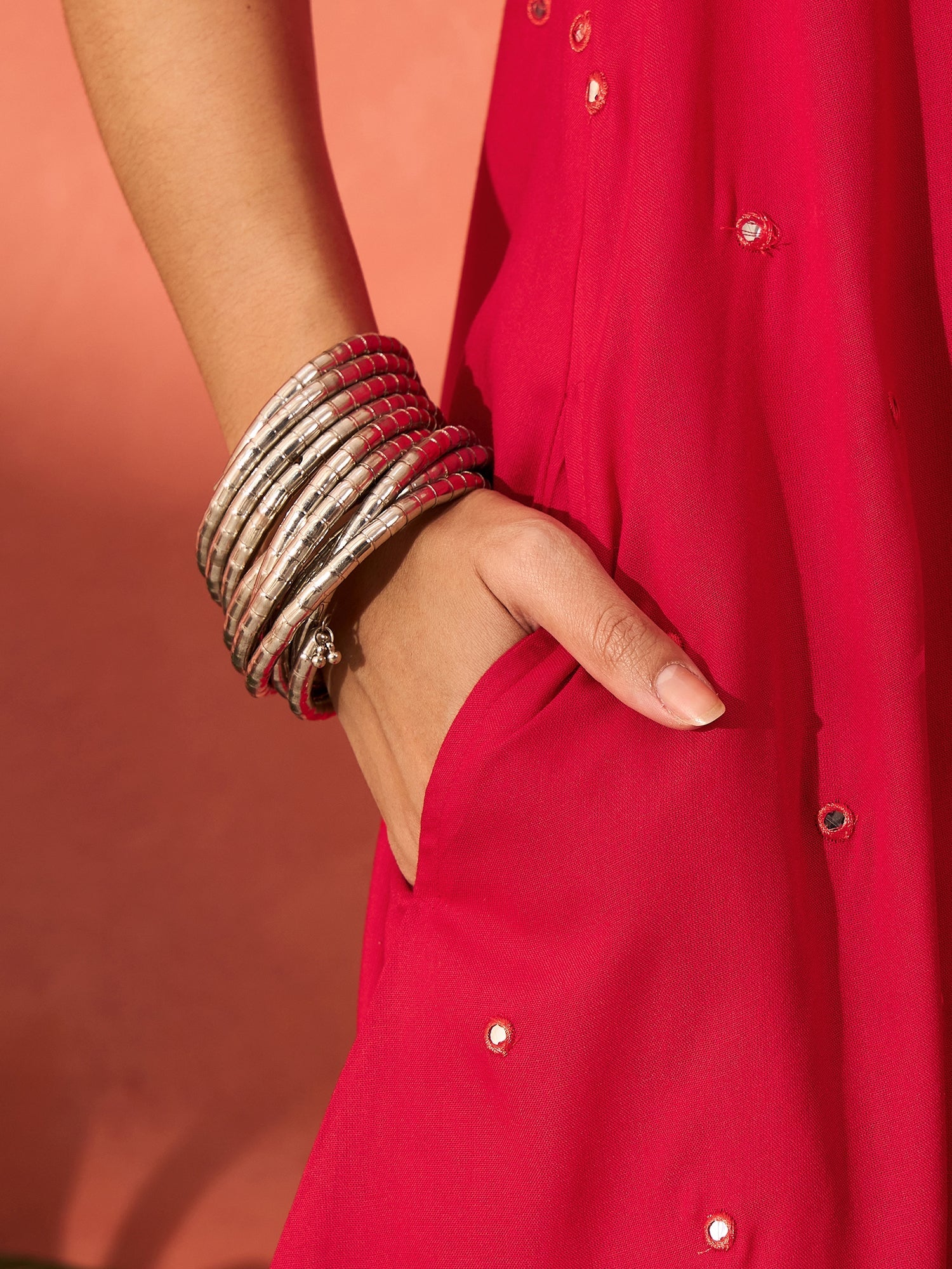 The Red Mirror Work Round Neck W/S Dress is a vibrant and eye-catching piece that combines traditional embellishments with a modern silhouette. Here's a detailed description and styling tips: