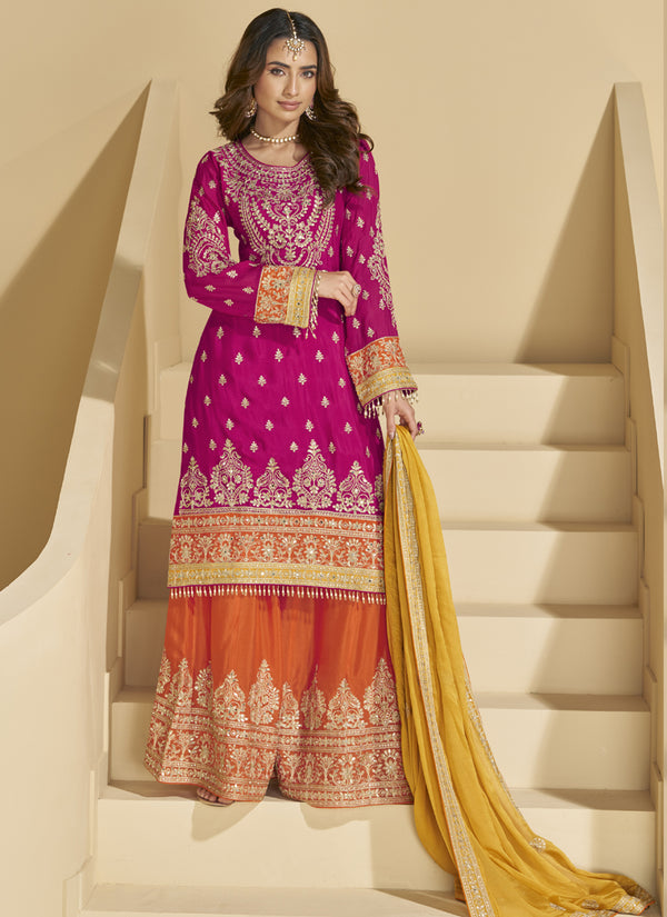 Vegaa Fashion Rani Pink Chinon Silk Embroidered Palazzo SuitProduct Details:Wedding suit is the perfect choice for Indian festive or wedding event....