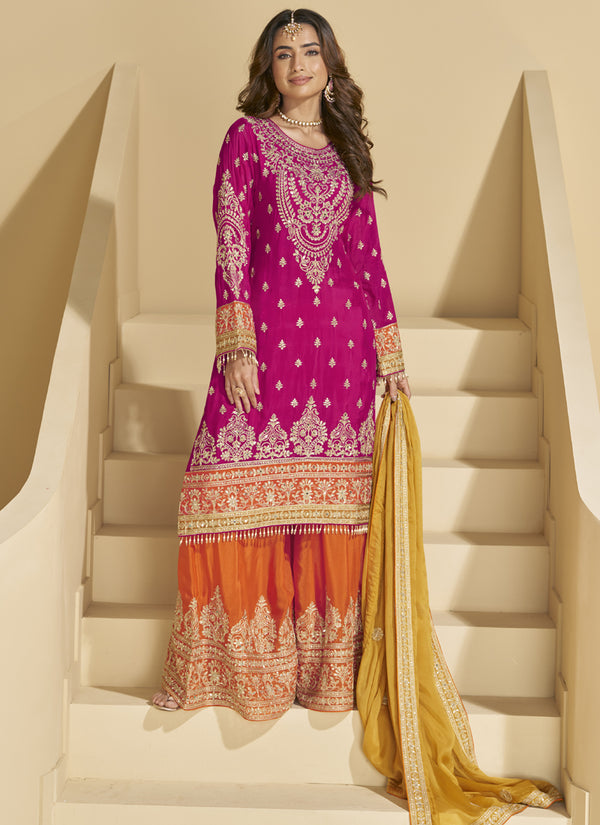 Vegaa Fashion Rani Pink Chinon Silk Embroidered Palazzo Suit