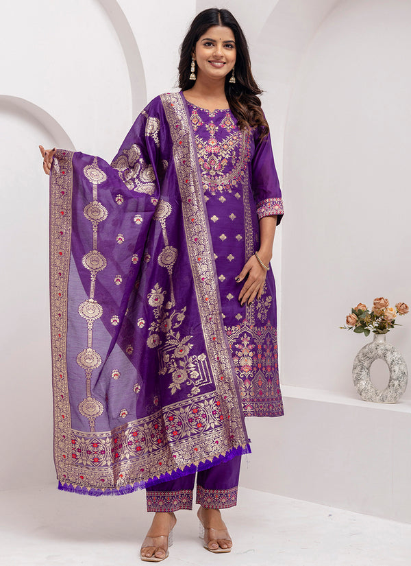 Channel royal elegance with this Royal Blue Jacquard Silk Suit. Embroidery adds richness, making it perfect for grand parties and weddings.
