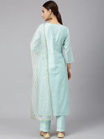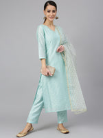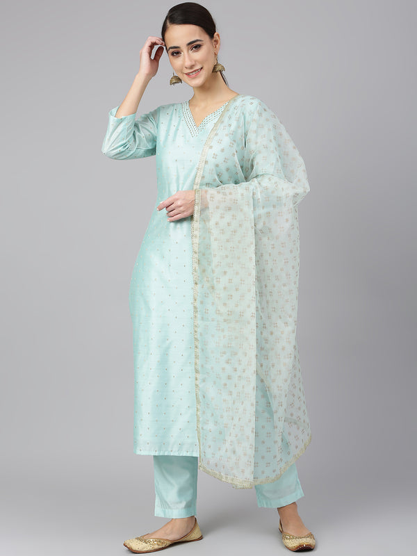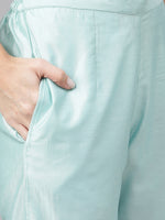 Janasya is here to serve you this sea green chanderi kurta set. It features straight kurta, v-neck, 3/4th sleeve and has a beautiful sequence work on the work. This kurta comes along with pant which is partially elasticated and a beautiful dupatta which enhance the whole look. Team it up with minimal accessories complete the look.