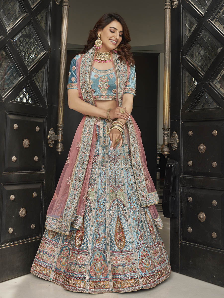 Myra Turquoise Velvet Embroidered Designer Lehenga - Distacart