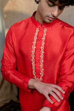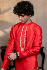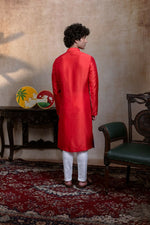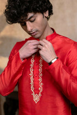 Falling Raw Silk Red Padma Gopala By Hilo DesignBring divine charm to your festive wardrobe with this crimson red falling raw silk kurta set. The n...