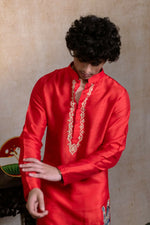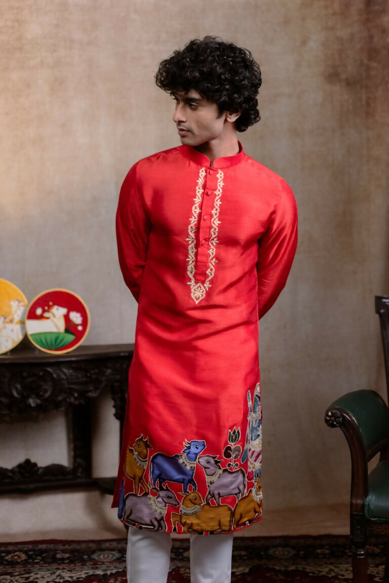 Bring divine charm to your festive wardrobe with this crimson red falling raw silk kurta set. The neckline is beautifully detailed with golden embroidery, while the hemline is adorned with vibrant hand-painted murals of Lord Krishna and his beloved cows. This fusion of rich fabric, intricate artwork, and traditional motifs creates an ensemble that is both timeless and celebratory. Ideal for weddings, pujas, and cultural festivities.