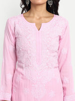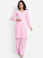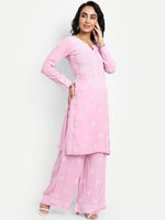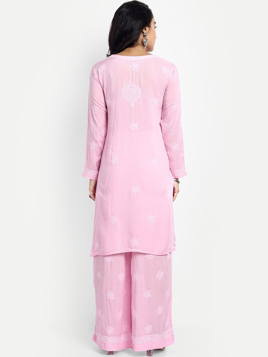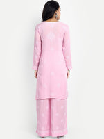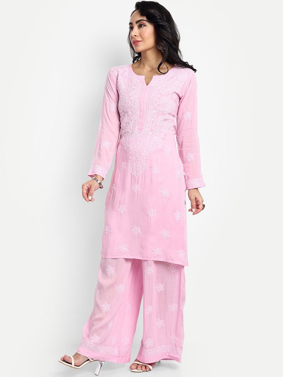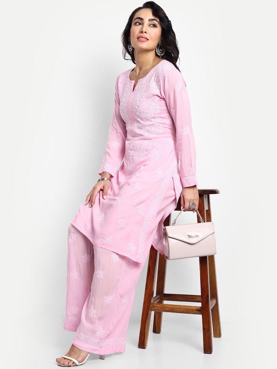 ADA Floral Embroidered Round Neck Long Sleeve Regular Chikankari Kurta With Palazzos Product Details Pink and white embroidered kurta with palaz...