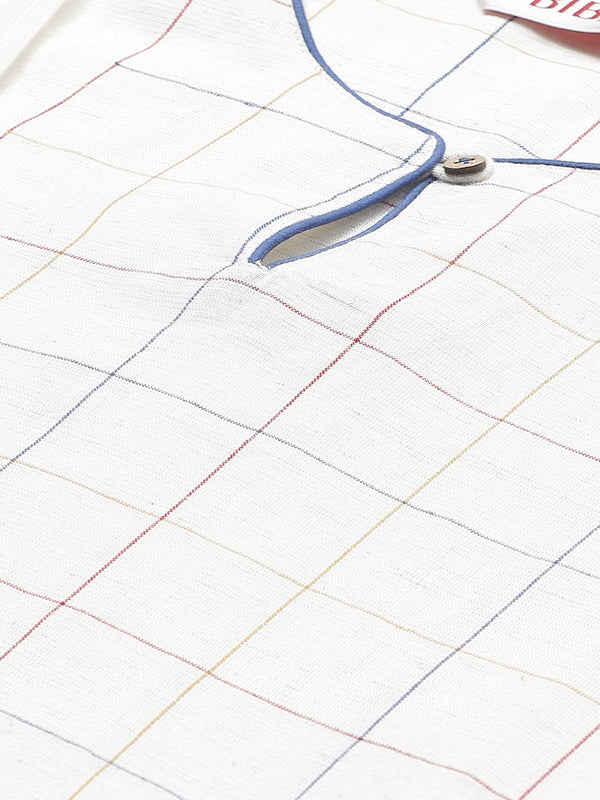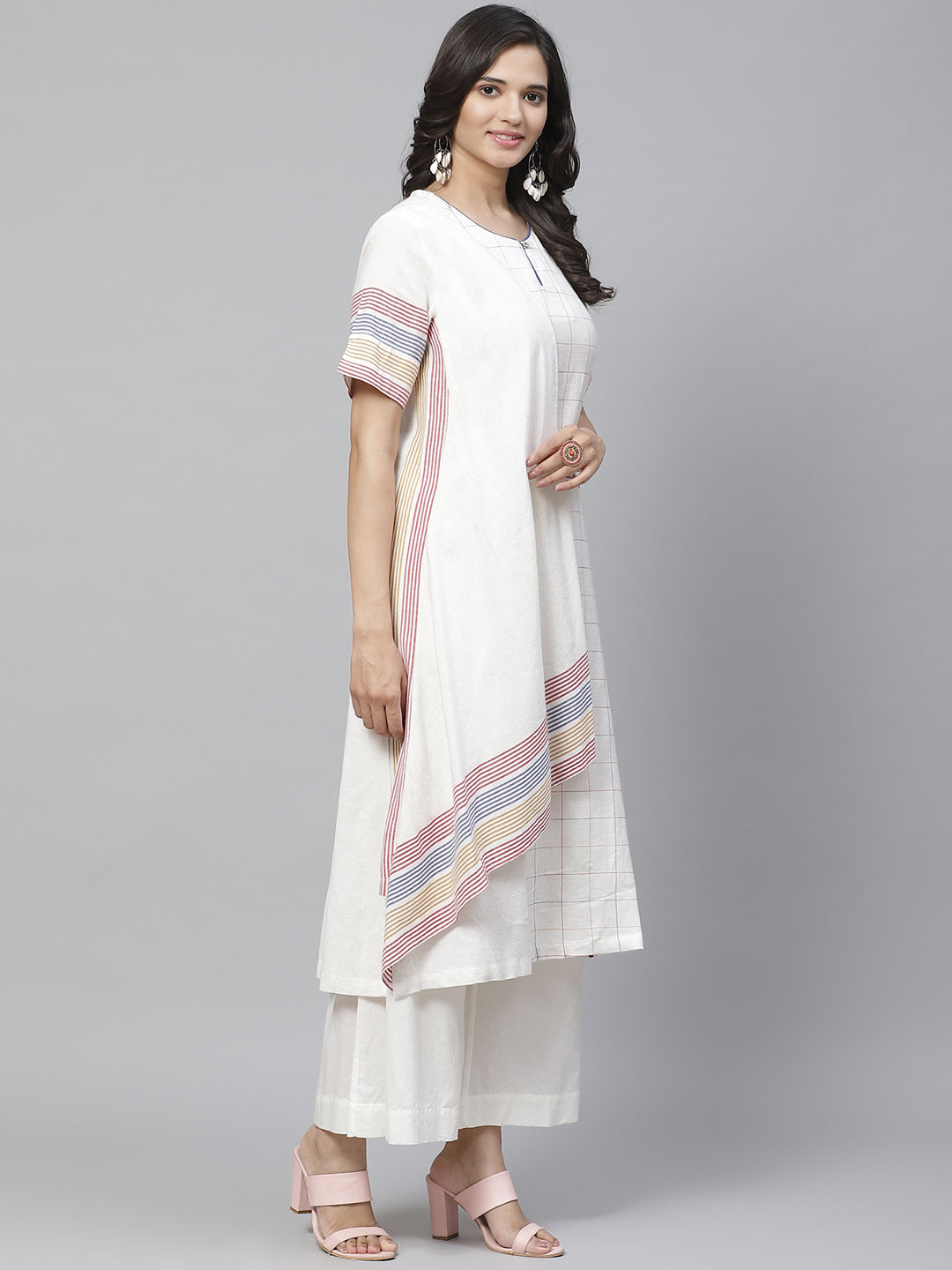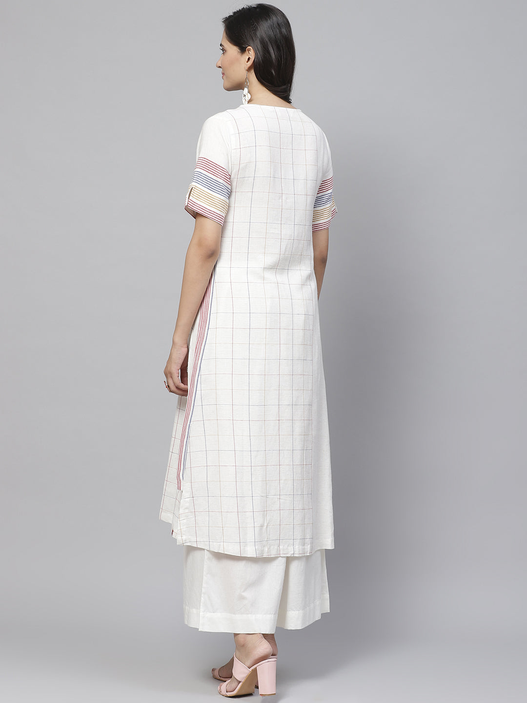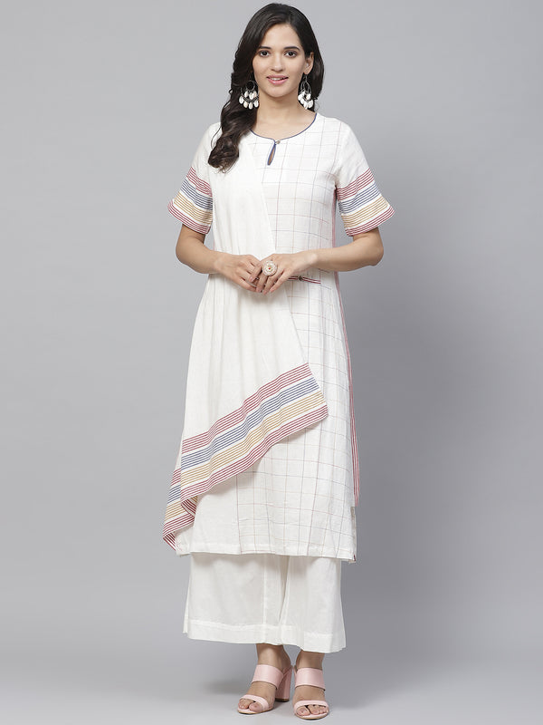 Off-White and blue checked A-line calf length kurta with layered detail, has a keyhole neck, short sleeves, flared hem