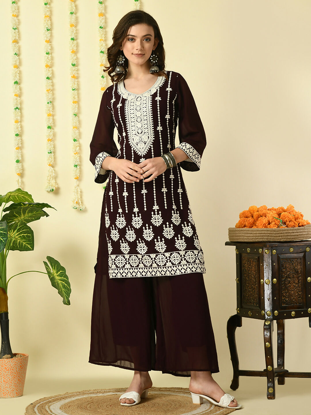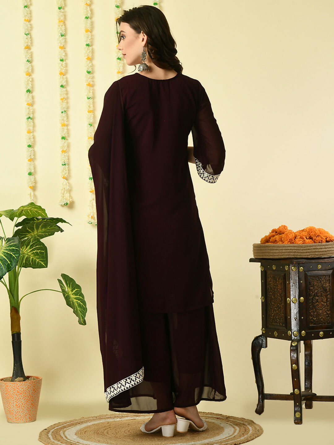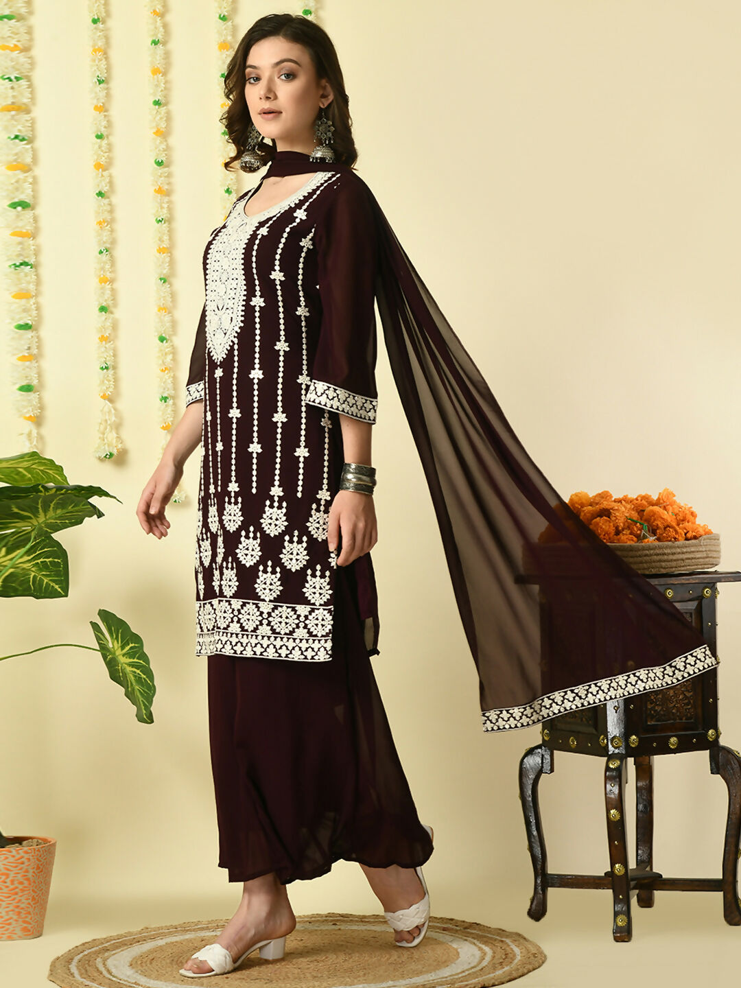 Myshka Women's Coffee Brown Georgette Kurta & Palazzos With Dupatta Party Sets Color: Coffee Brown Top Type: Kurta Bottom Type: Palazzos D...