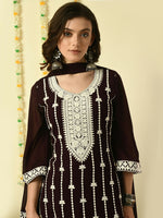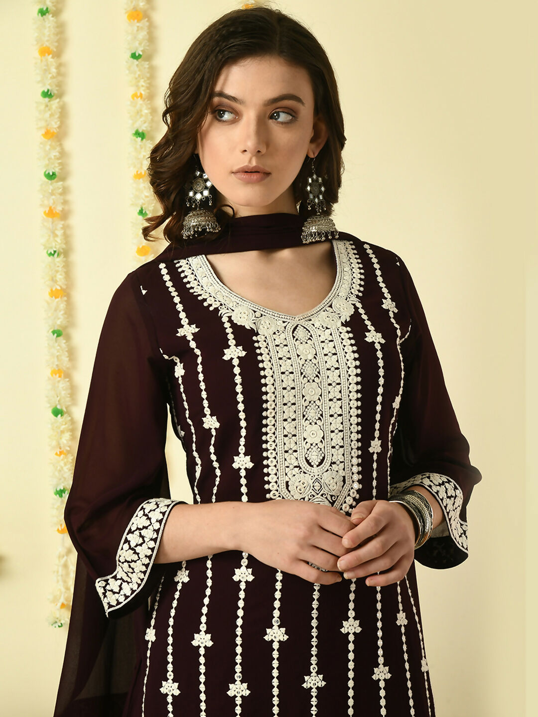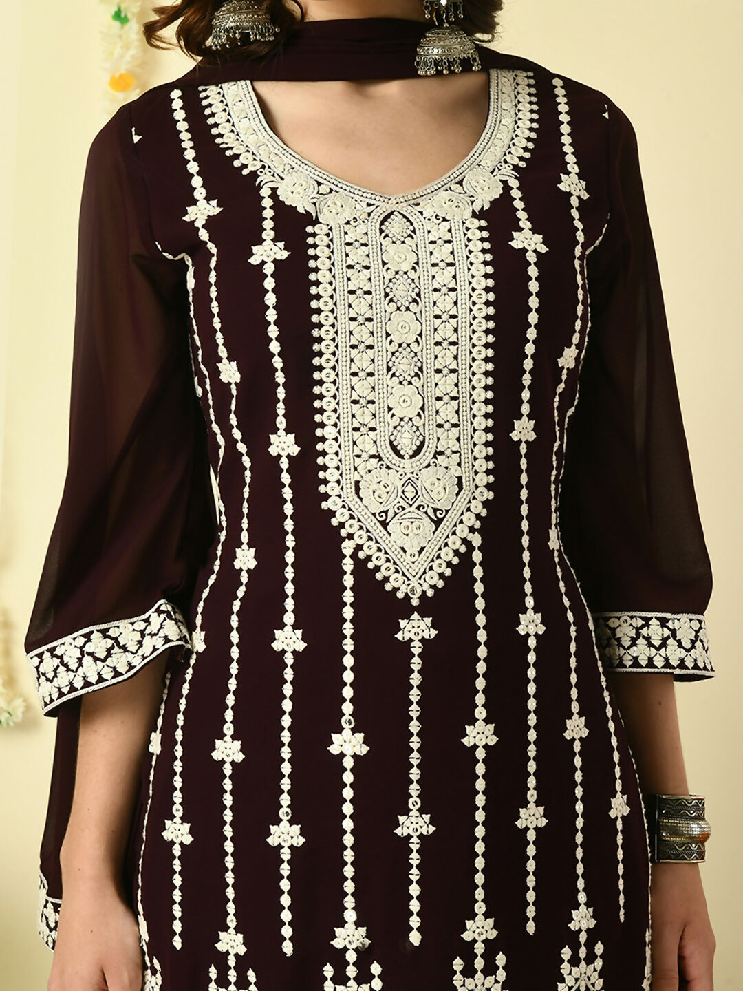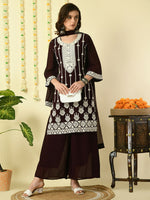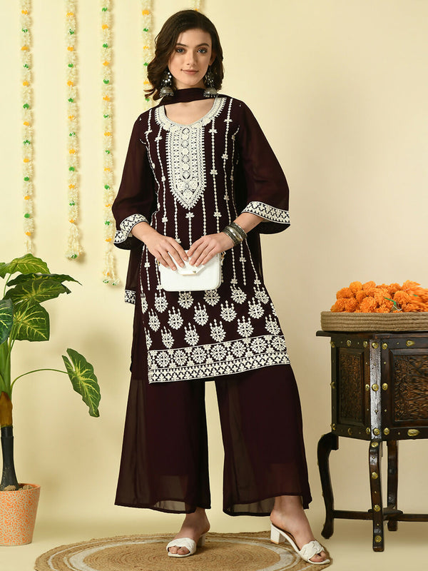 Myshka Women's Coffee Brown Georgette Kurta & Palazzos With Dupatta Party Sets Color: Coffee Brown Top Type: Kurta Bottom Type: Palazzos D...