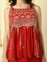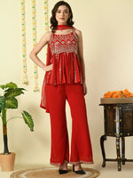 Myshka Women's Red Georgette Top & Palazzos With Dupatta Party Sets Color: Red Top Type: Top Bottom Type: Palazzos Dupatta: yes Dupatta F...