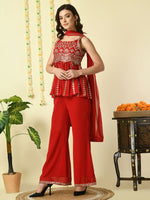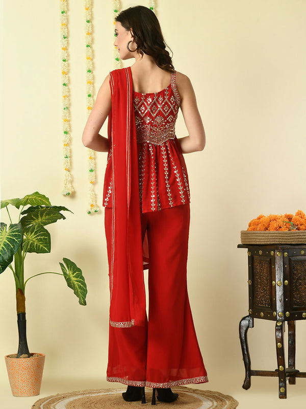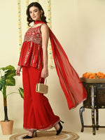 Myshka Women's Red Georgette Top & Palazzos With Dupatta Party Sets