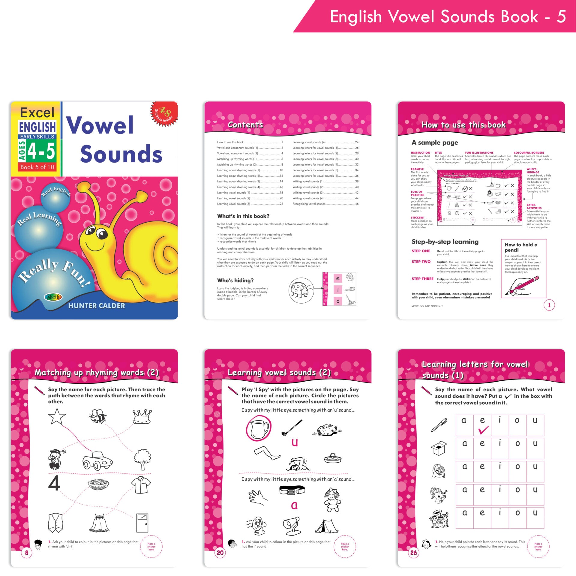 • Sheth Publishing House Published the Excel Skill Book is illustrated by the following objects;1) Learn to distinguish between objects that are different or recognize similarities between them2) Help your child to develop logic and identify the right sequence of events 3) Identify, understand and learn the relationship between letters and their sounds4) Recognize word patterns and rhymes, match the word with the corresponding object, practice sounds of words and much more,5) Develop and improve your comprehension skills by reading short illustrated stories and answering simple questions related to them6) To basic two dimensional and three-dimensional shapes of all sizes in this beautifully illustrated book,7) To recognize patterns and group similar items8) Easy and fun activities for counting numbers, Includes revision of numbers,9) To easy counting exercises including activities like drawing patterns and coloring numbers,10) To teach your children the most basic division and multiplication calculations,11) It comes with colorful stickers for grading children's progress.