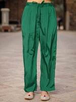 The Eid Collection green chinnon and kasturi silk Alia cut kurta set with floral prints and embroidery. Gathers for volume, straight silhouette, calf length, V neckline, side slits, slip-on style. Accompanied by solid kasturi silk pants with drawstring, partially elasticated waist, and intricate mirror work for added charm.