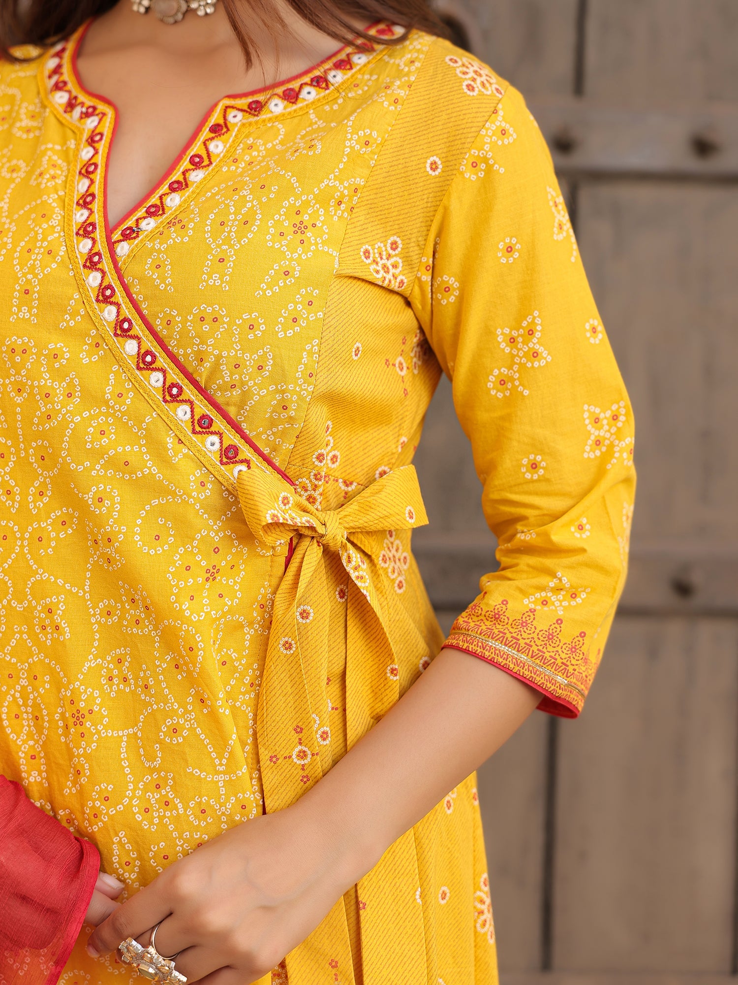 Juniper Mustard Bandhani Print Angrakha Cotton Kurta With Pants & Dupatta Set With Mirror Work Embroidery - Distacart