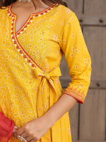 Juniper Mustard Bandhani Print Angrakha Cotton Kurta With Pants & Dupatta Set With Mirror Work Embroidery