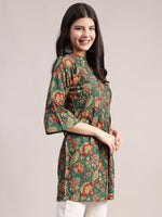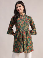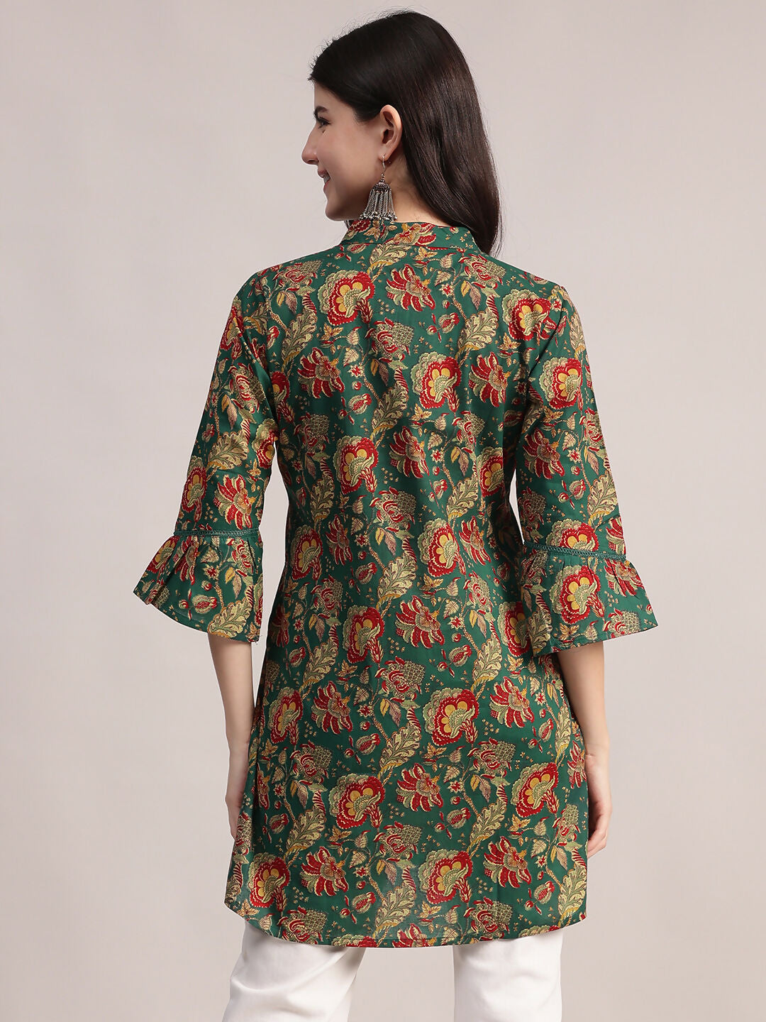 Aavyora Women's Ethnic Floral Printed Tunic - Green with Red & Gold Accents, Pin-Tucked Front, and Flared HemThis women's tunic combines tradit...