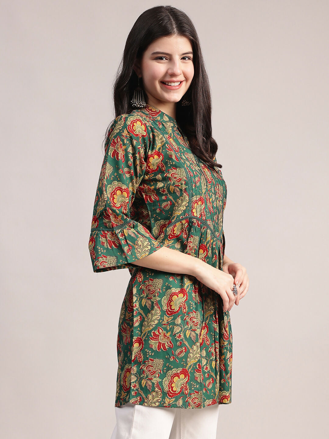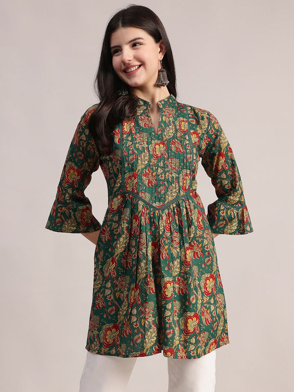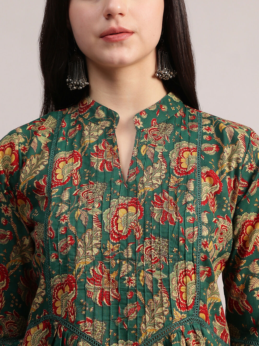 Aavyora Women's Ethnic Floral Printed Tunic - Green with Red & Gold Accents, Pin-Tucked Front, and Flared Hem