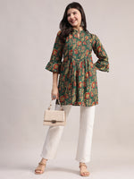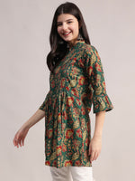 This women's tunic combines traditional aesthetics with modern style. The vibrant floral prints in striking red and gold hues stand out beautifully against the rich Green background. The pin-tuck detailing on the yoke and pleated flare design bring a sophisticated touch, while the 3/4 sleeves provide a versatile and comfortable fit. Crafted from soft and breathable cotton, this tunic is ideal for casual outings, office wear, or festive celebrations. Pair it with contrasting bottoms and accessories for an effortlessly chic look.