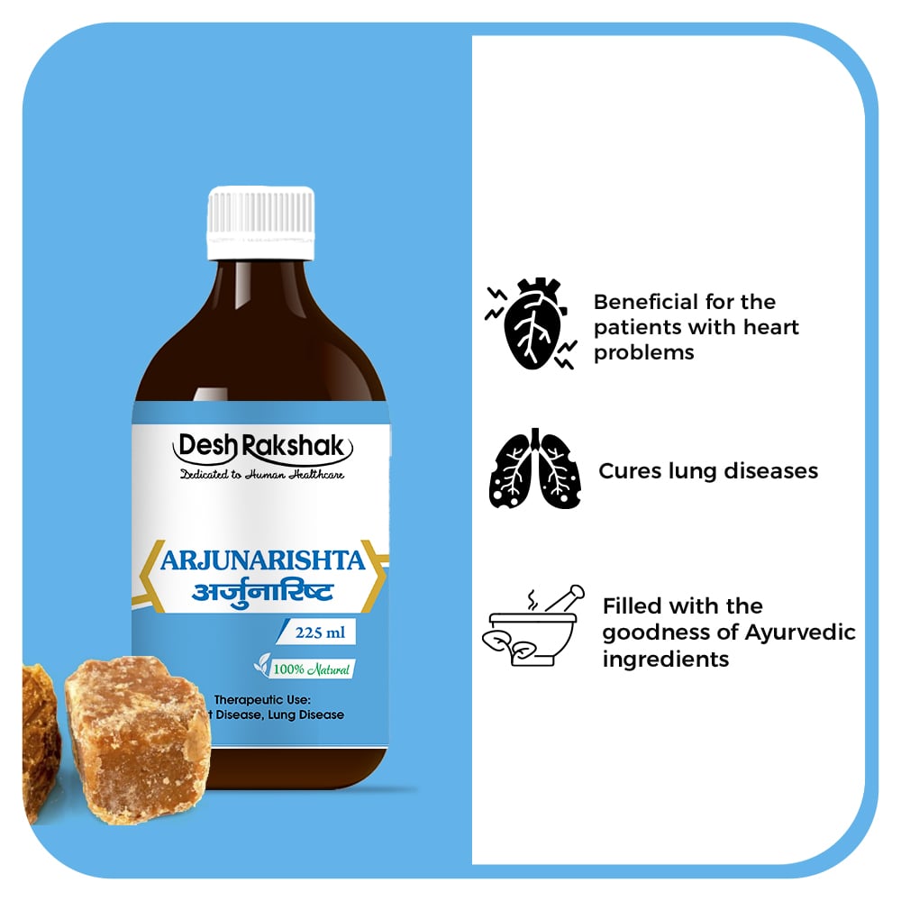 Desh Rakshak Arjunarishta Key Ingredients– Arjuna Tvak, Draksha, MadhukaPrakshap Dravya of: Dhataki, Guda How to Use– 1-2 teaspoonful twice a day o...