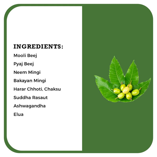 Key Ingredients- Mooli Beej, Pyaj Beej, Neem Mingi, Bakayan Mingi, Harar Chhoti, Chaksu, Suddha Rasaut, Ashwagandha, Elua