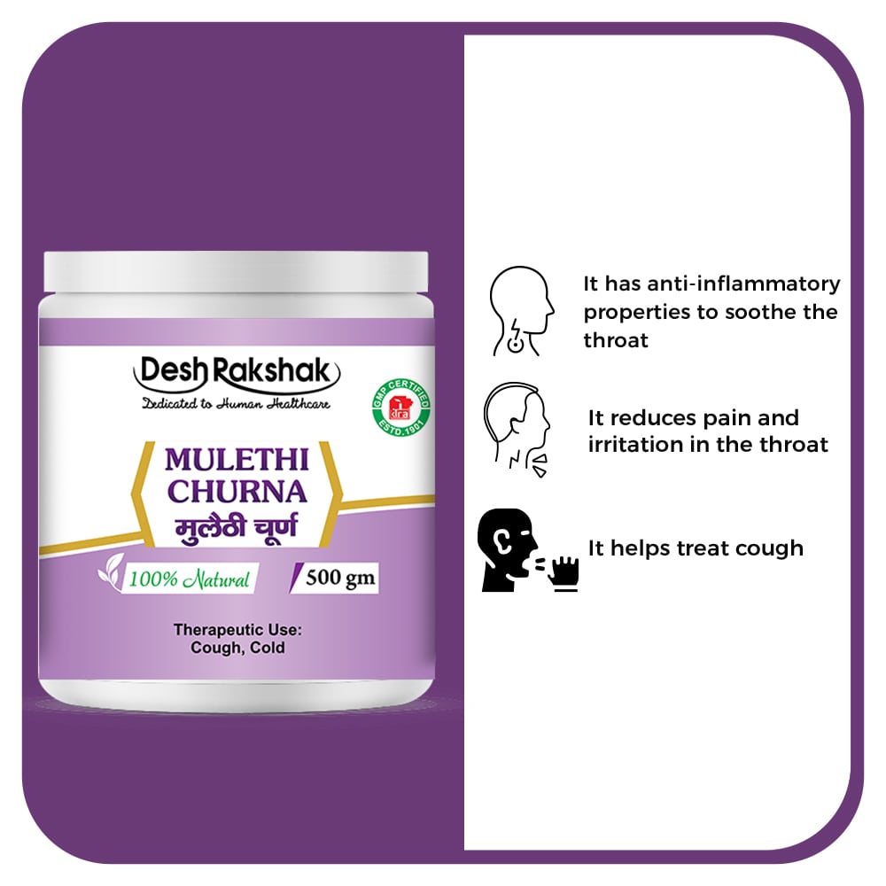 Desh Rakshak Mulethi Churna Key Benefits- Cold Cough Key Ingredients– Mulethi How to Use– 1-2 teaspoonful with water or as directed by the physic...
