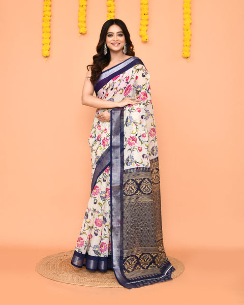 Piyari Fashion Women's Off White Printed Cotton Saree With Zari Border