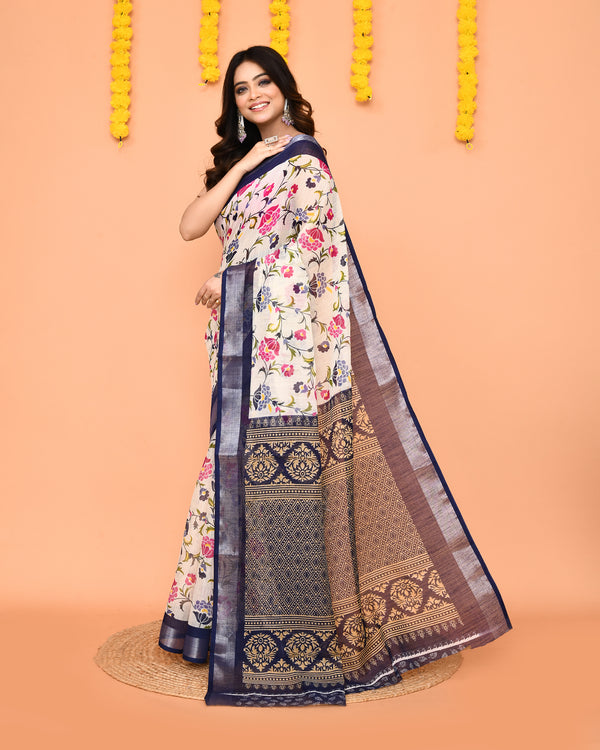 Piyari Fashion Women's Off White Printed Cotton Saree With Zari BorderProduct Details:This stunning Off White handspun cotton saree is the perfect ...