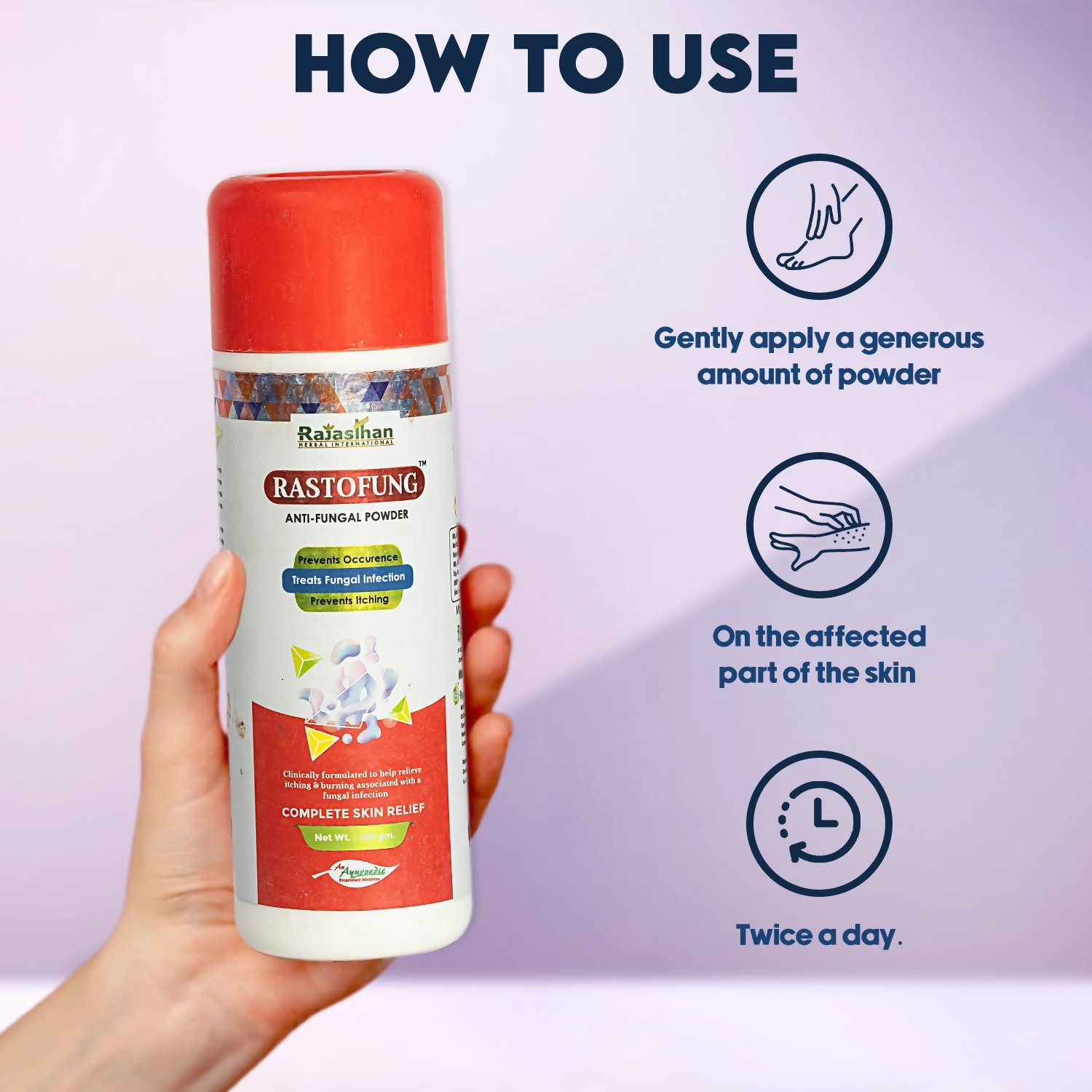 • Gently apply a generous amount of powder on the affected part of the skin twice a day.