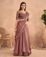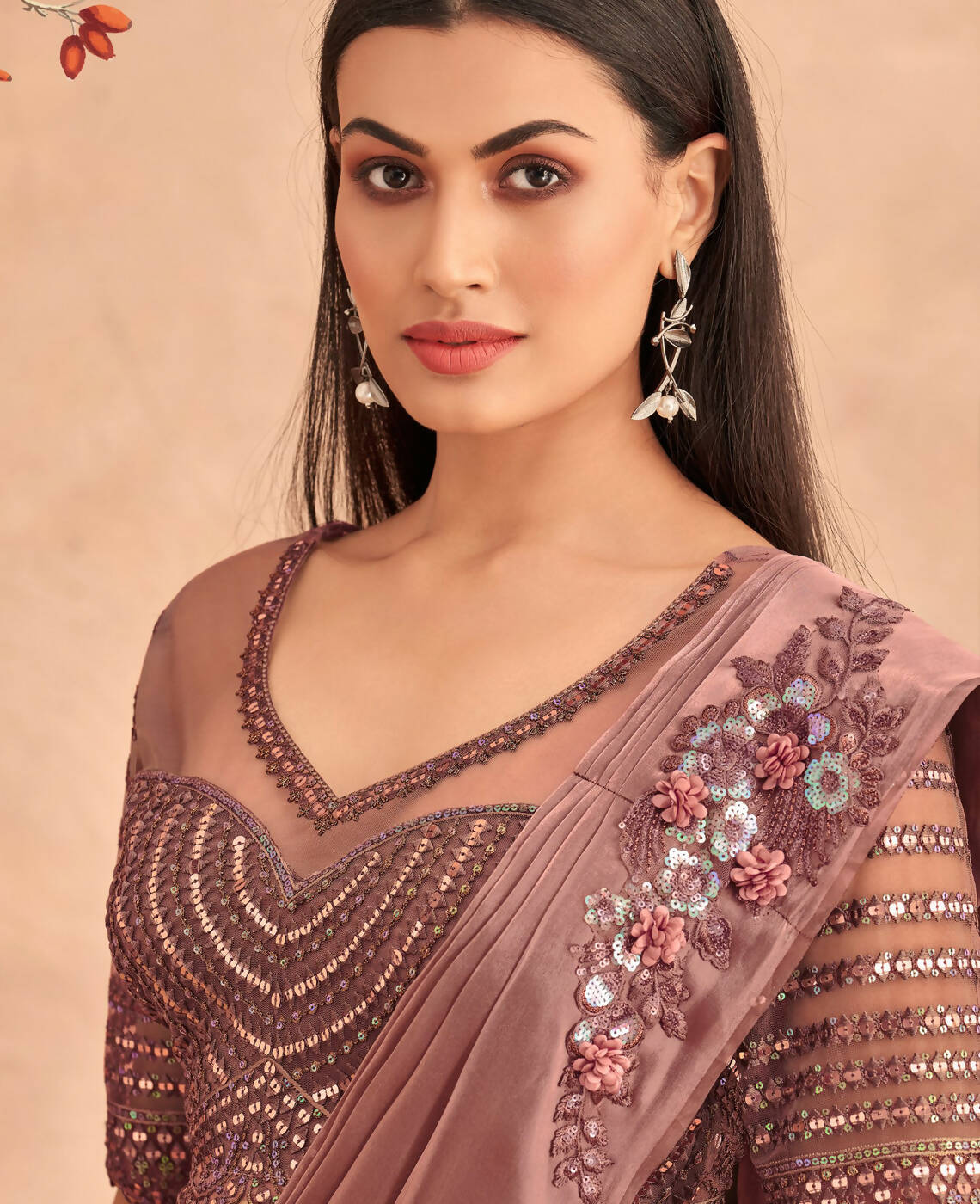 Dark Mauve Satin Embroidered Ready To Wear Saree With Unstitched Blouse Piece - Nandika