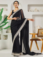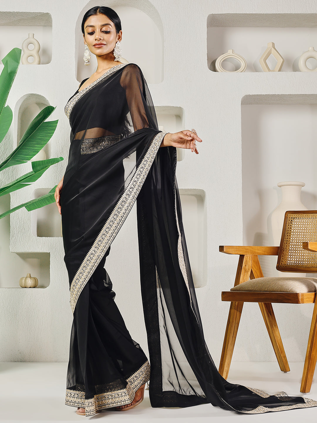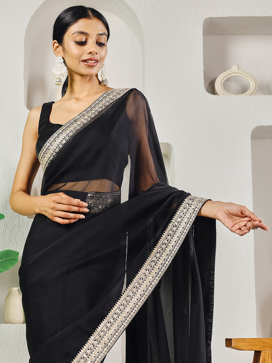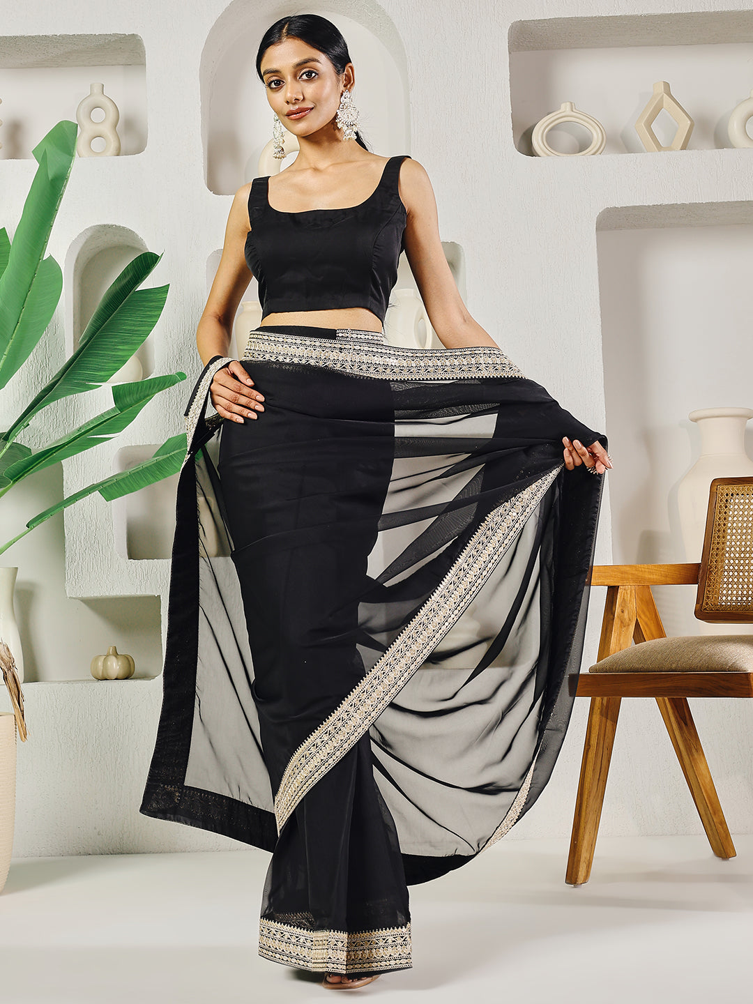 Elevate your ethnic wardrobe with our exquisite Black Solid Ready to Wear Saree, elegantly paired with a stunning golden lace dupatta. This ensemble effortlessly blends traditional charm with modern convenience, making it the perfect choice for any occasion, from festive celebrations to evening gatherings. Crafted from premium quality fabric, the saree drapes beautifully, providing a flattering silhouette that enhances your natural grace. The golden lace dupatta adds a touch of opulence, ensuring you stand out wherever you go.