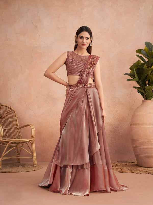 Pink Satin Embroidered Ready To Wear Saree With Unstitched Blouse Piece - Nandika About the product: This colored stitched saree is made from Sati...