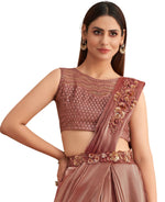 Pink Satin Embroidered Ready To Wear Saree With Unstitched Blouse Piece - Nandika