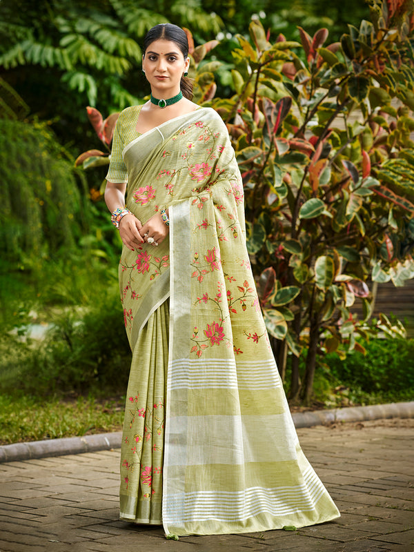 Sangam Prints Lime Green Linen Woven Work Traditional Saree - Free Size