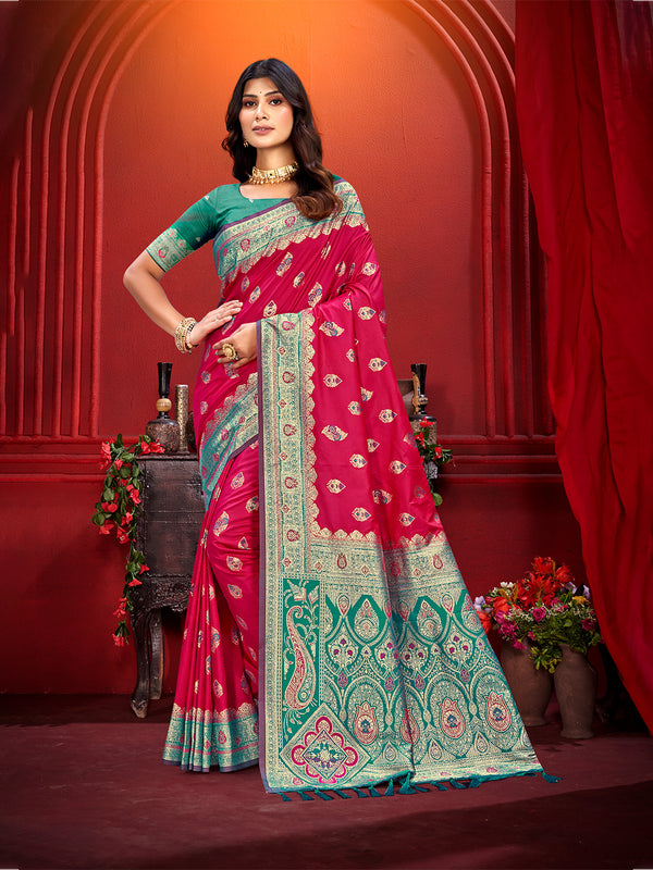 Sangam Prints Rani Pink Silk Woven Work Traditional Saree - Free Size
