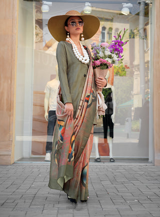 Astita Elegant Olive Green Organza Saree with Golden Zari Border - Festive & Office Wear Saree with Blouse Piece