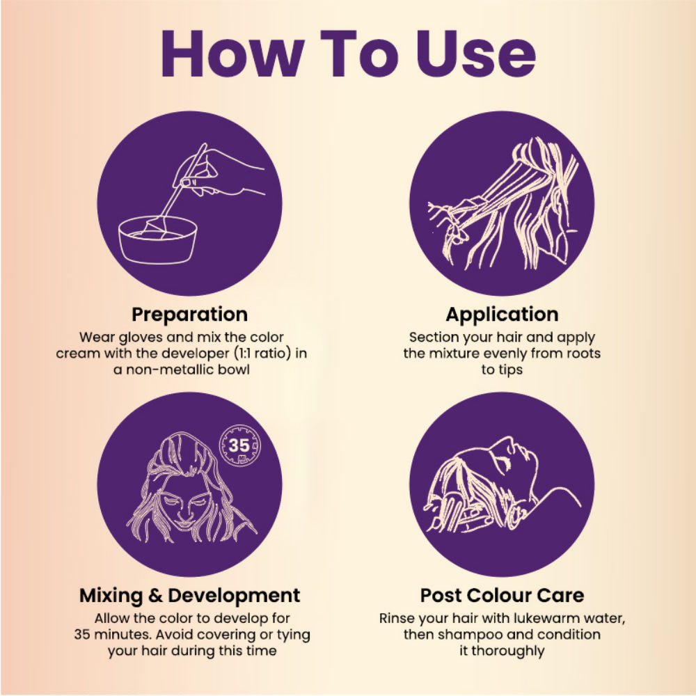 • Mixing & Development: Allow the colour to develop for 35 minutes.Avoid covering your hair or tying during this time.