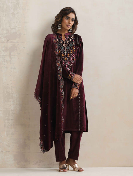 trueBrowns Purple Velvet Geometric Embroidered Kurta Pant Dupatta SetDescription Elevate your style with this purple velvet geometric embroidered k...