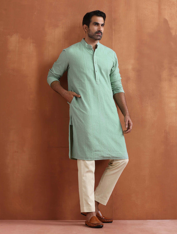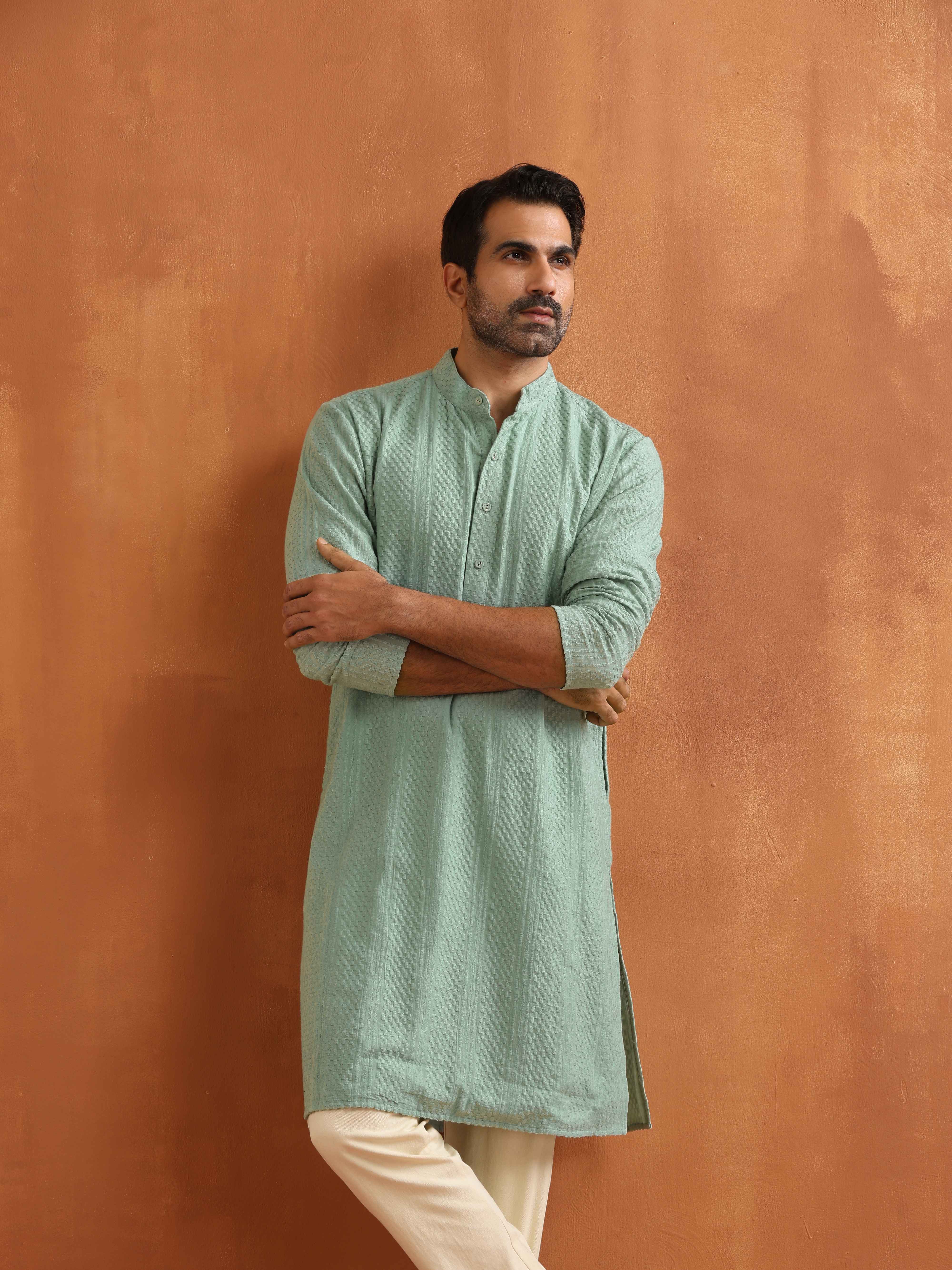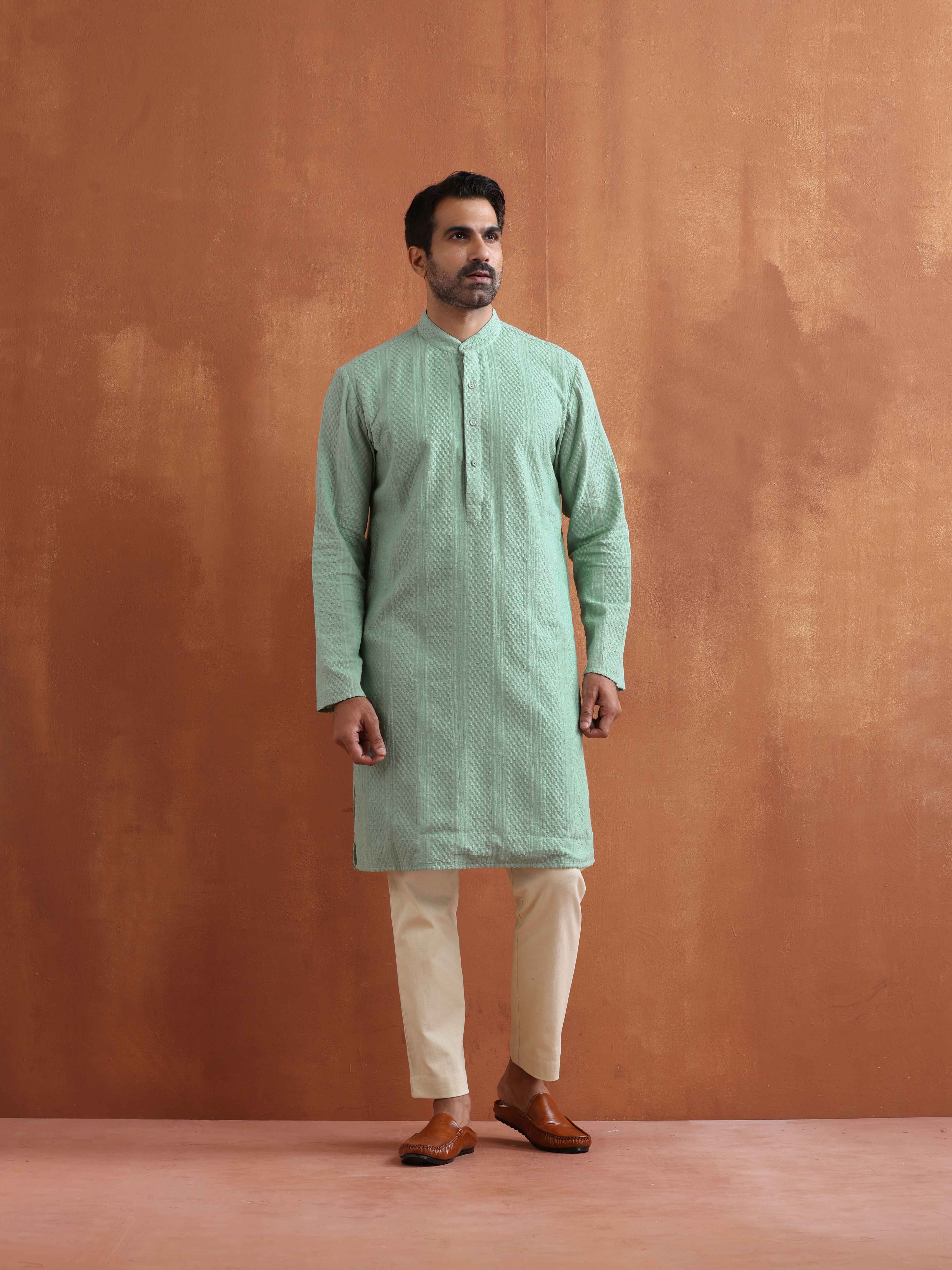 • Upgrade your festive wardrobe with this green cotton dobby kurta.