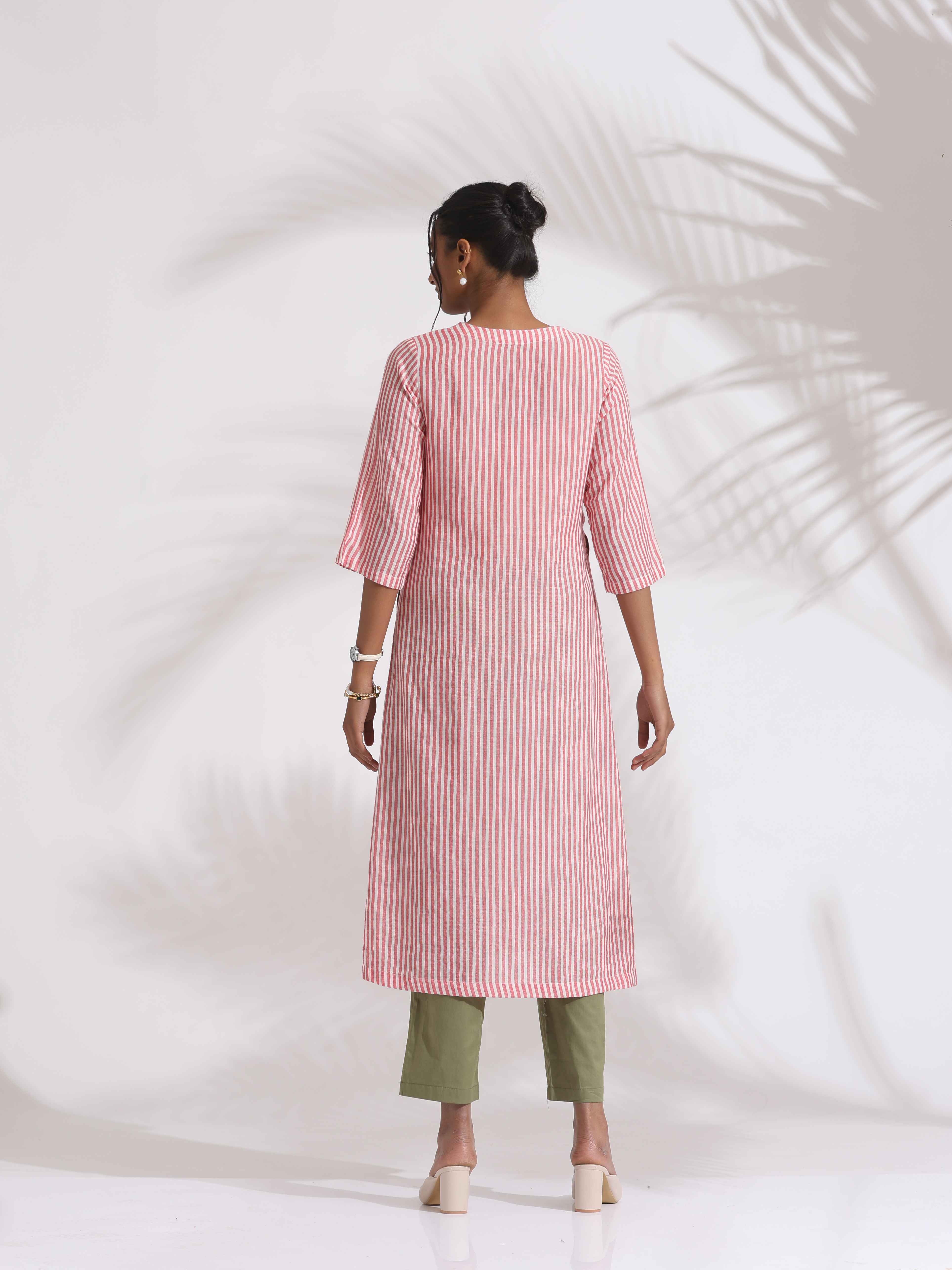 trueBrowns Red Cotton Stripe Straight Kurta Set
