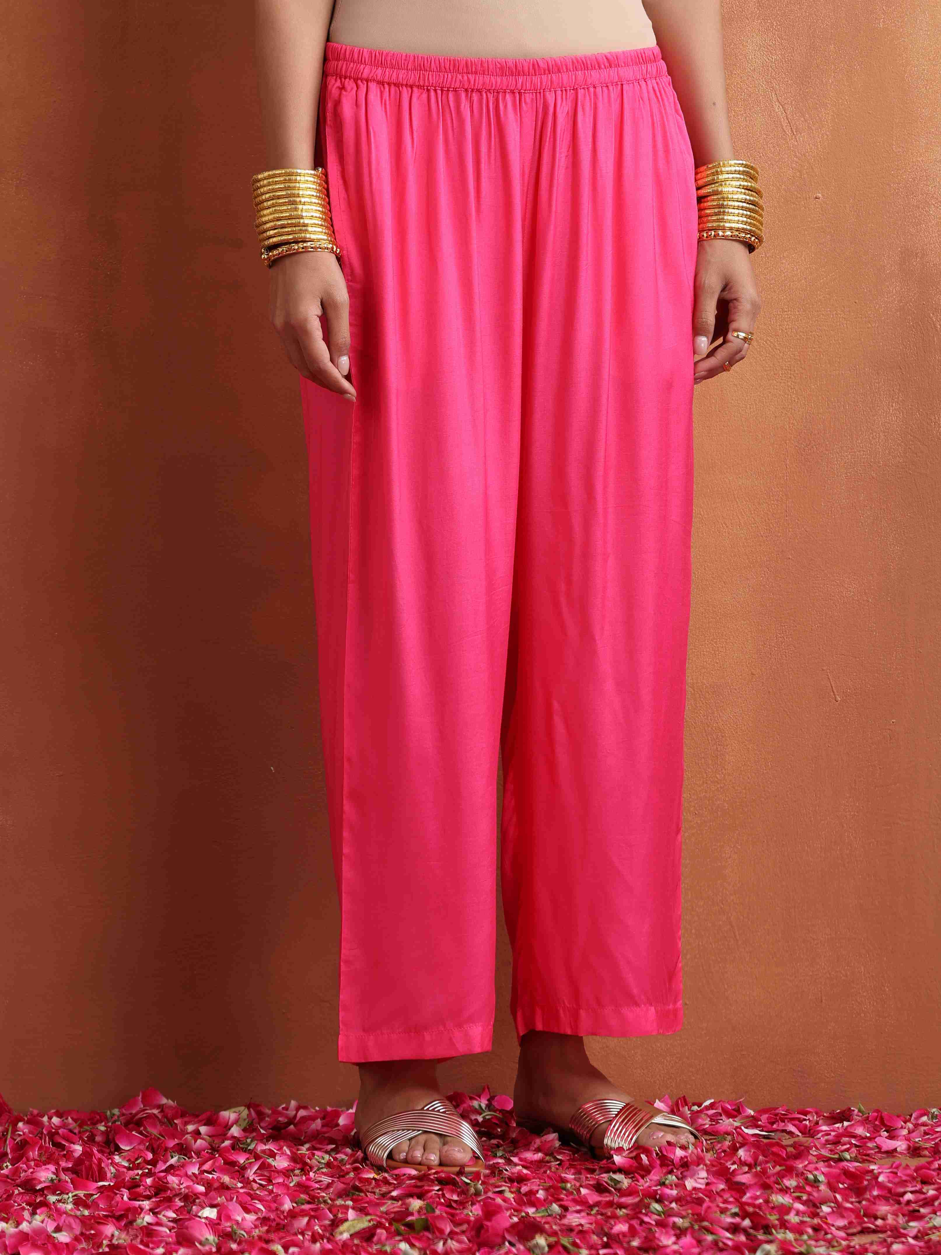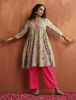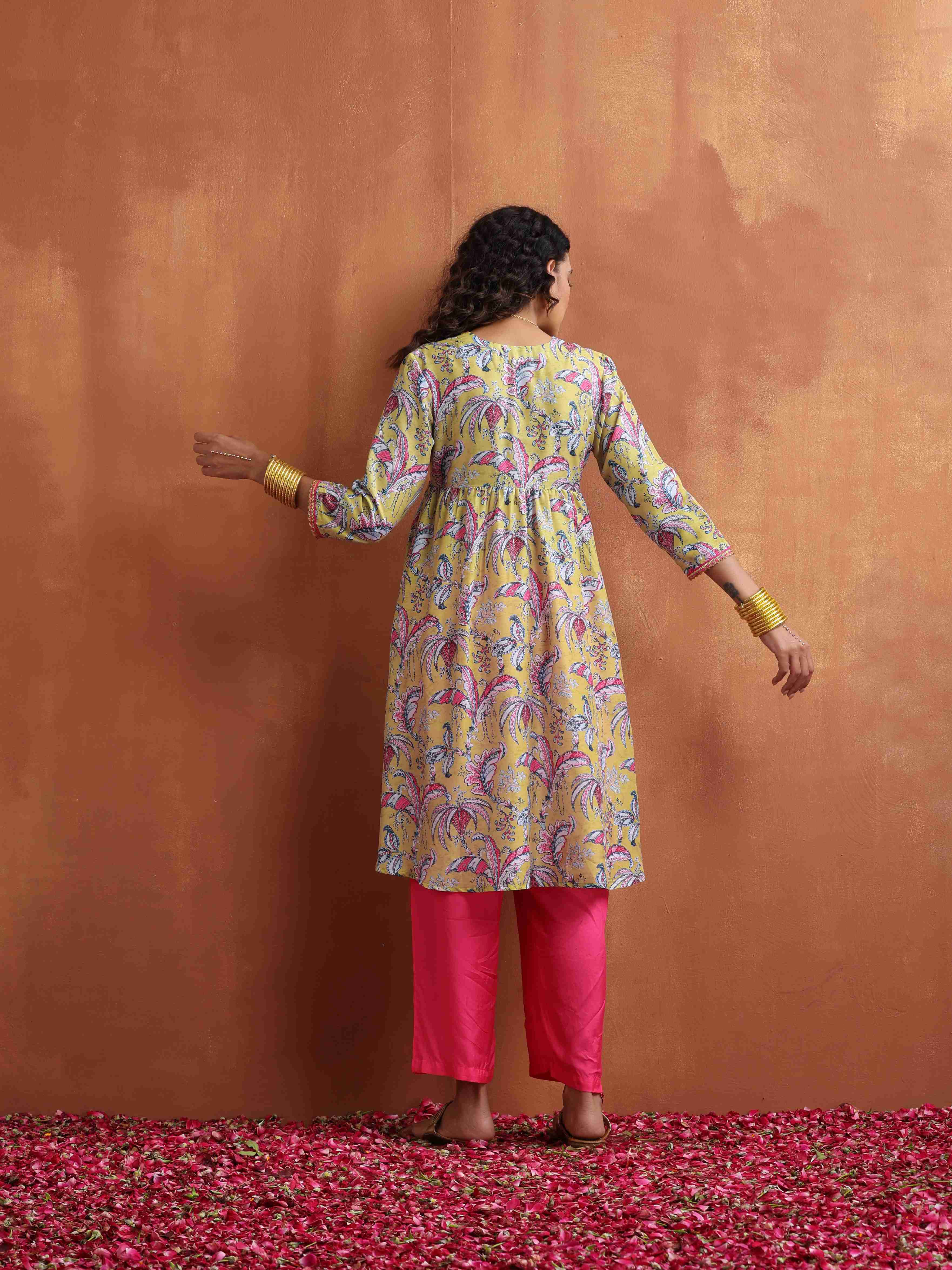 • Elevate your style with this yellow floral print anarkali kurta paired with pink pant
